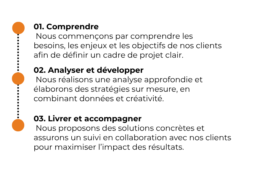 Nous combinons compréhension des enjeux, structuration des idées et exécution rigoureuse pour créer de la valeur concrète.